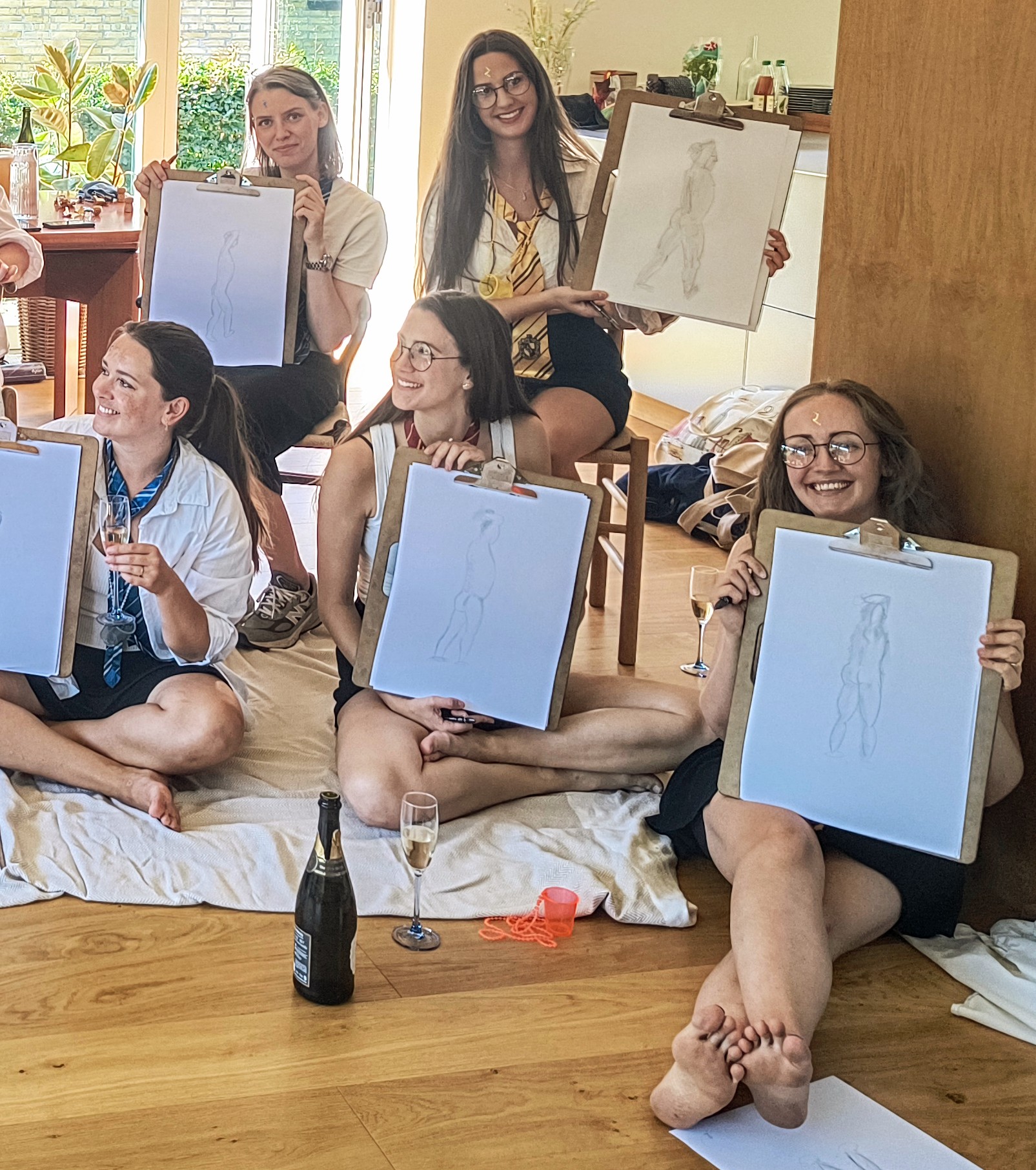 Jeg skræddersyer et arrangement, og medbringer alle materialer. Jeg har 15 års erfaring som croquismodel, herunder 10 års erfarring som model og underviser til pige-polterabend.