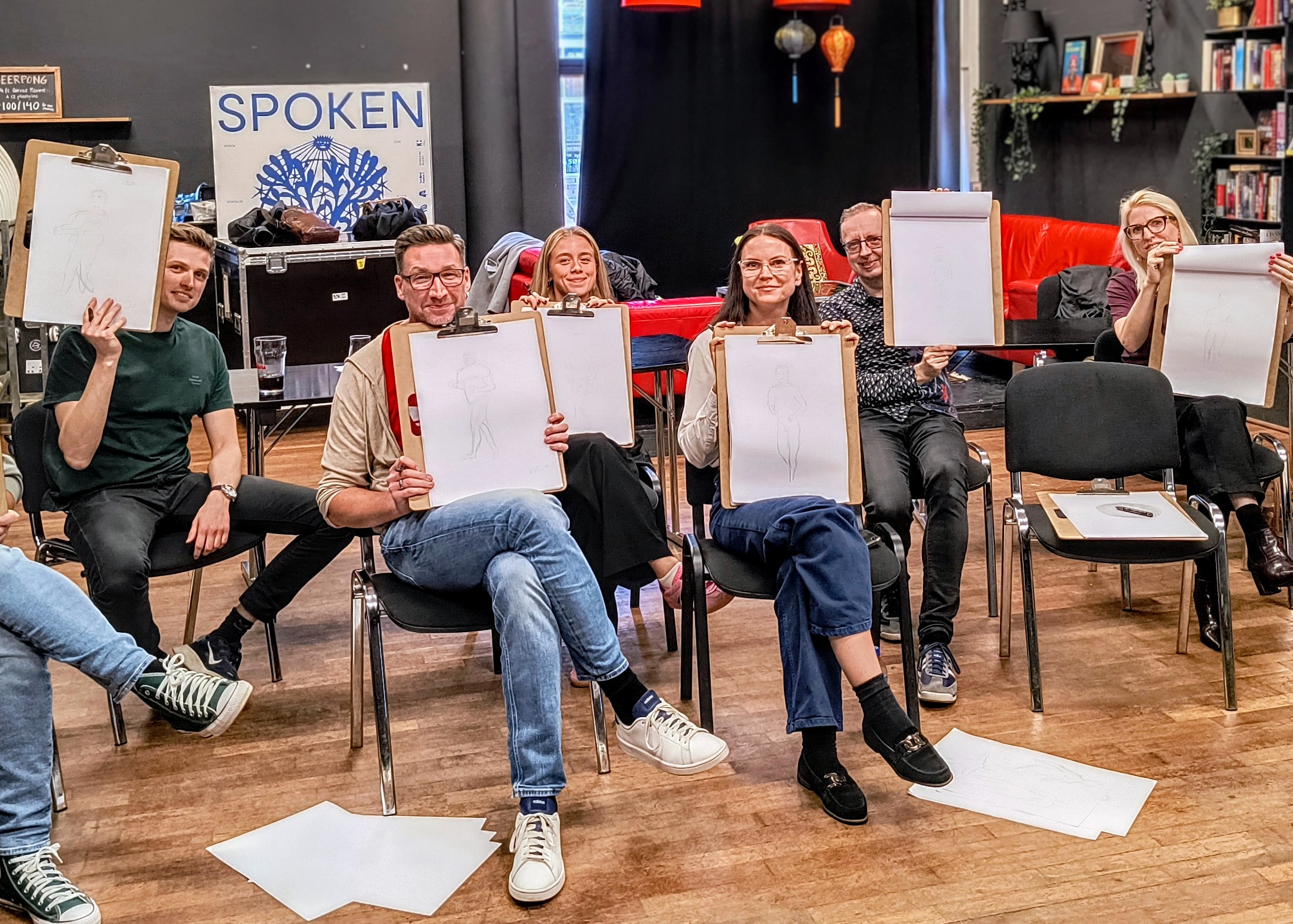 Jeg elsker at stå model, og mærke koncentrationen blandt deltagerne, se folk tegne, og mærke magien der indfinder sig blandt os. Det er en skøn følelse, der binder os sammen på en helt særlig og poetisk facon.